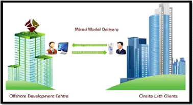 In Onsite/Offshore(Hybrid)Delivery Model,the outsourcing work is distributed between the service provider's onsite center and the offshore development center & there by the client gets the advantage of both types of out sourcing models.It is one of the most successful and popular outsourcing models employed today by many compnies.